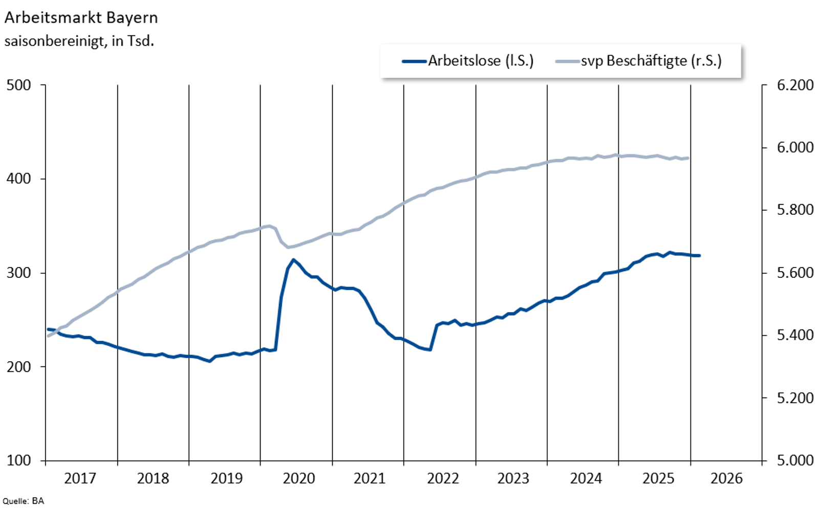 Die Zahl der sozialversicherungspflichtig Beschäftigten lag im Dezember 2025 (aktueller Wert) bei 5,964 Millionen. Im Vergleich zum Vorjahresmonat sank die Zahl um 4.700 bzw. 0,1 Prozent. Gegenüber dem Vormonat stieg sie saisonbereinigt um 1.000 Personen.